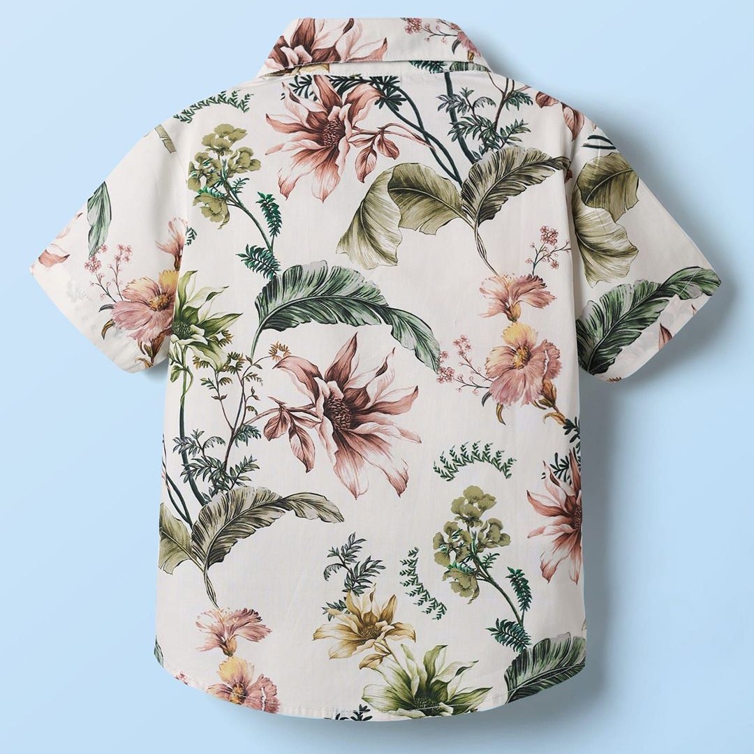 CrayonFlakes Boys Floral Printed Spread Collar Short Sleeves Cotton Shirt