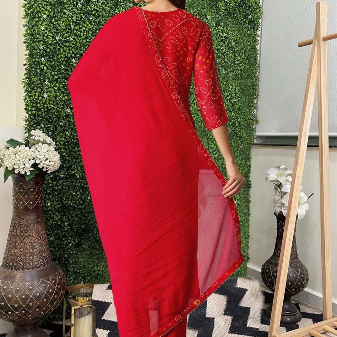 GoSriKi Bandhani Printed Round Neck Straight Kurta With Trousers & Dupatta