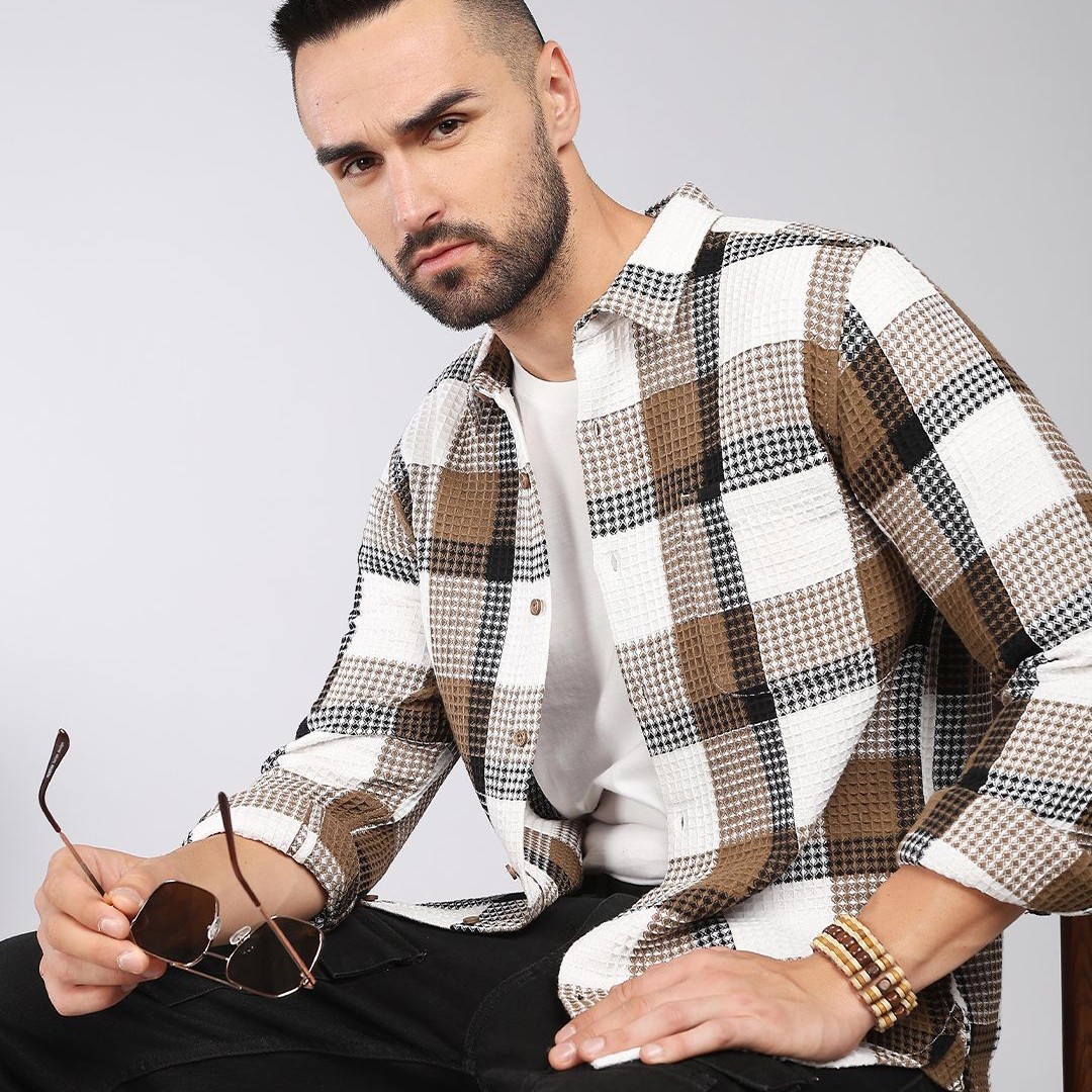 HERE&NOW Tartan Checks Spread Collar Long Sleeves Slim Fit Cotton Casual Shirt
