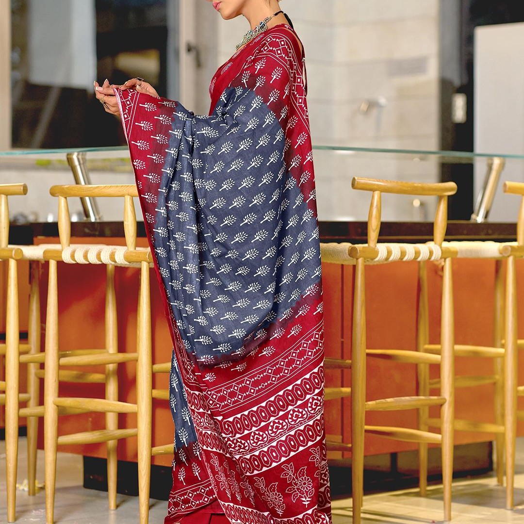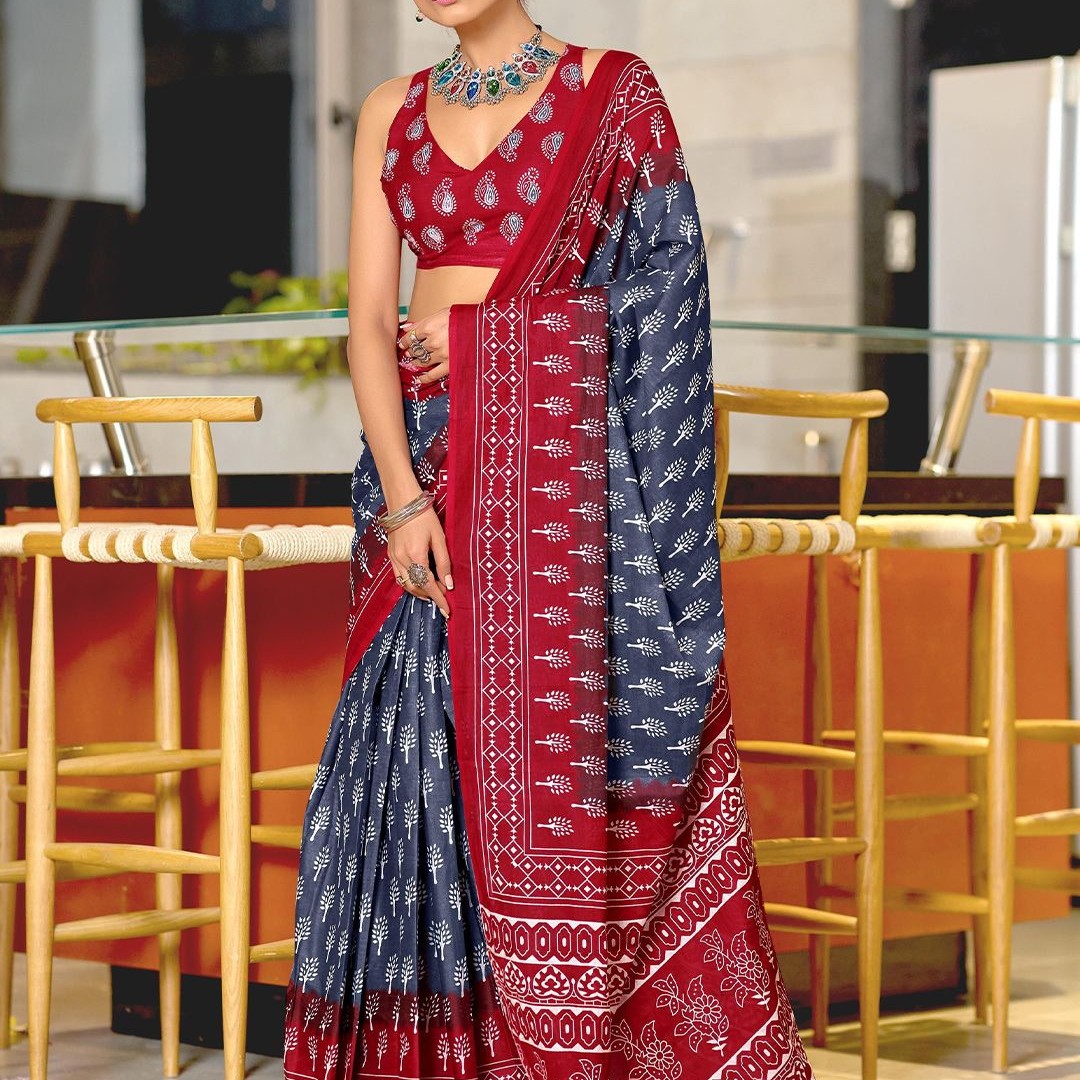Panzora Floral Block Printed Mulmul Cotton Ready To Wear Saree