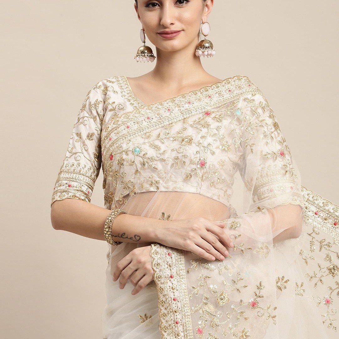 VAIRAGEE Off White Floral Embroidered Net Saree